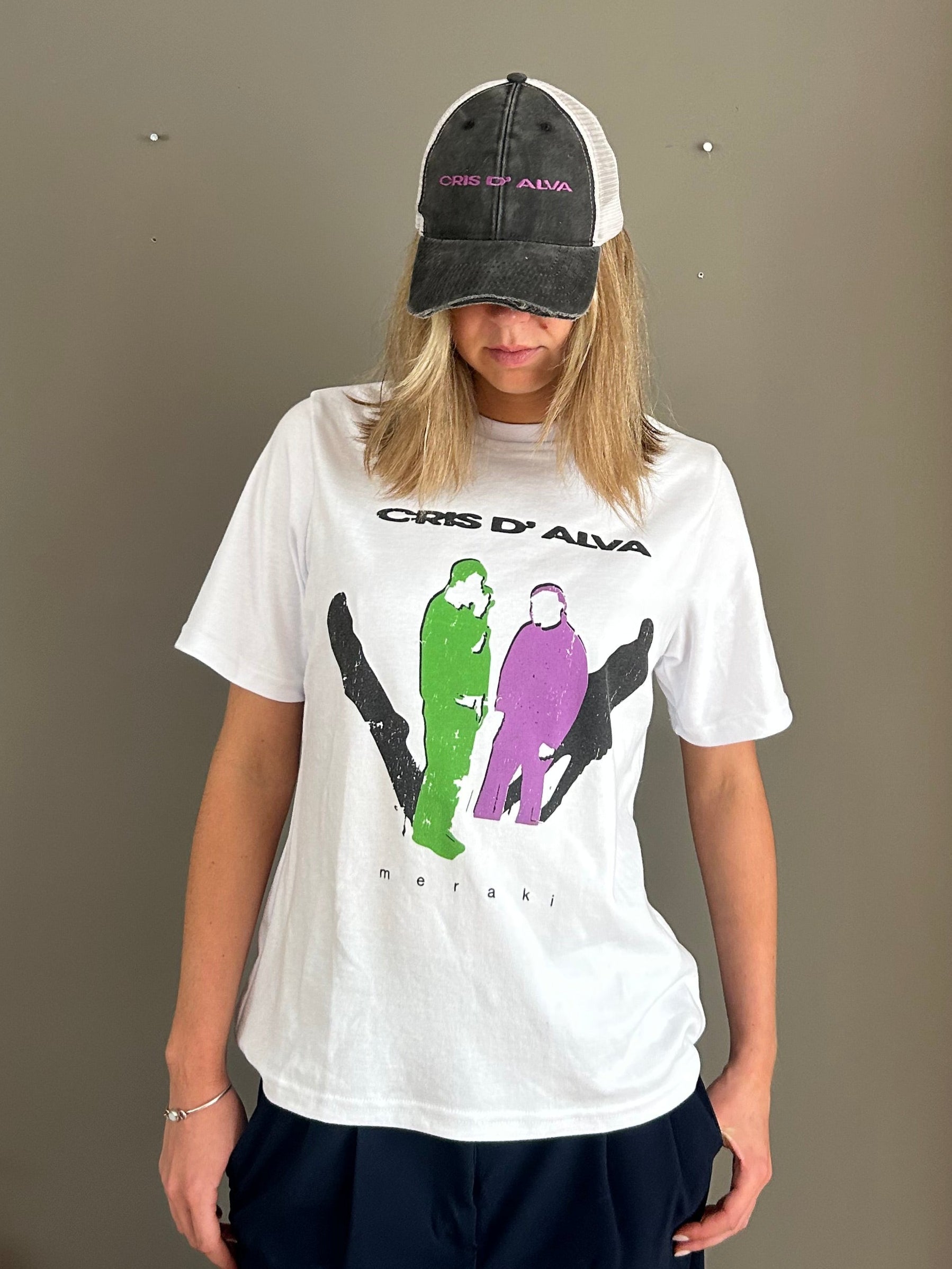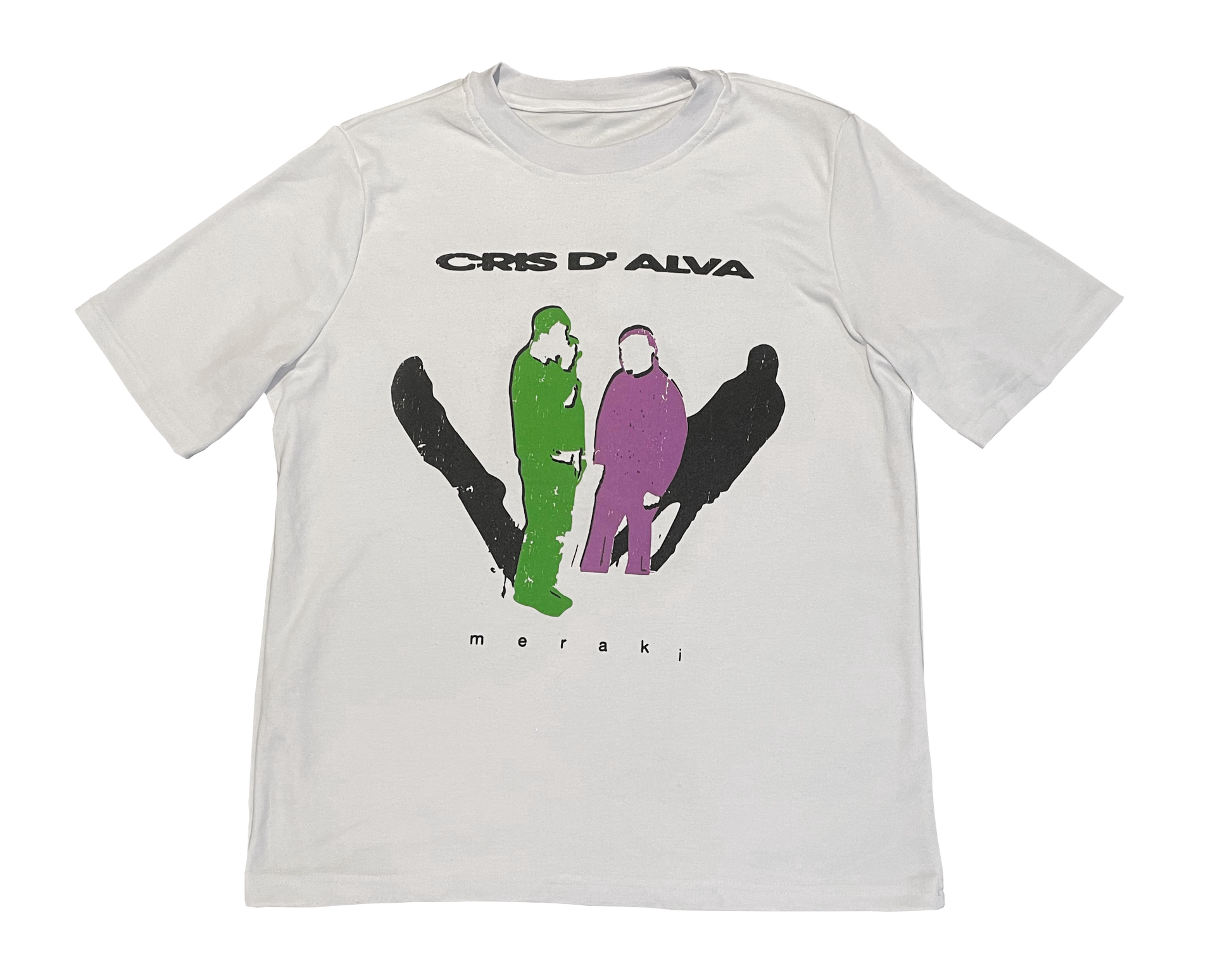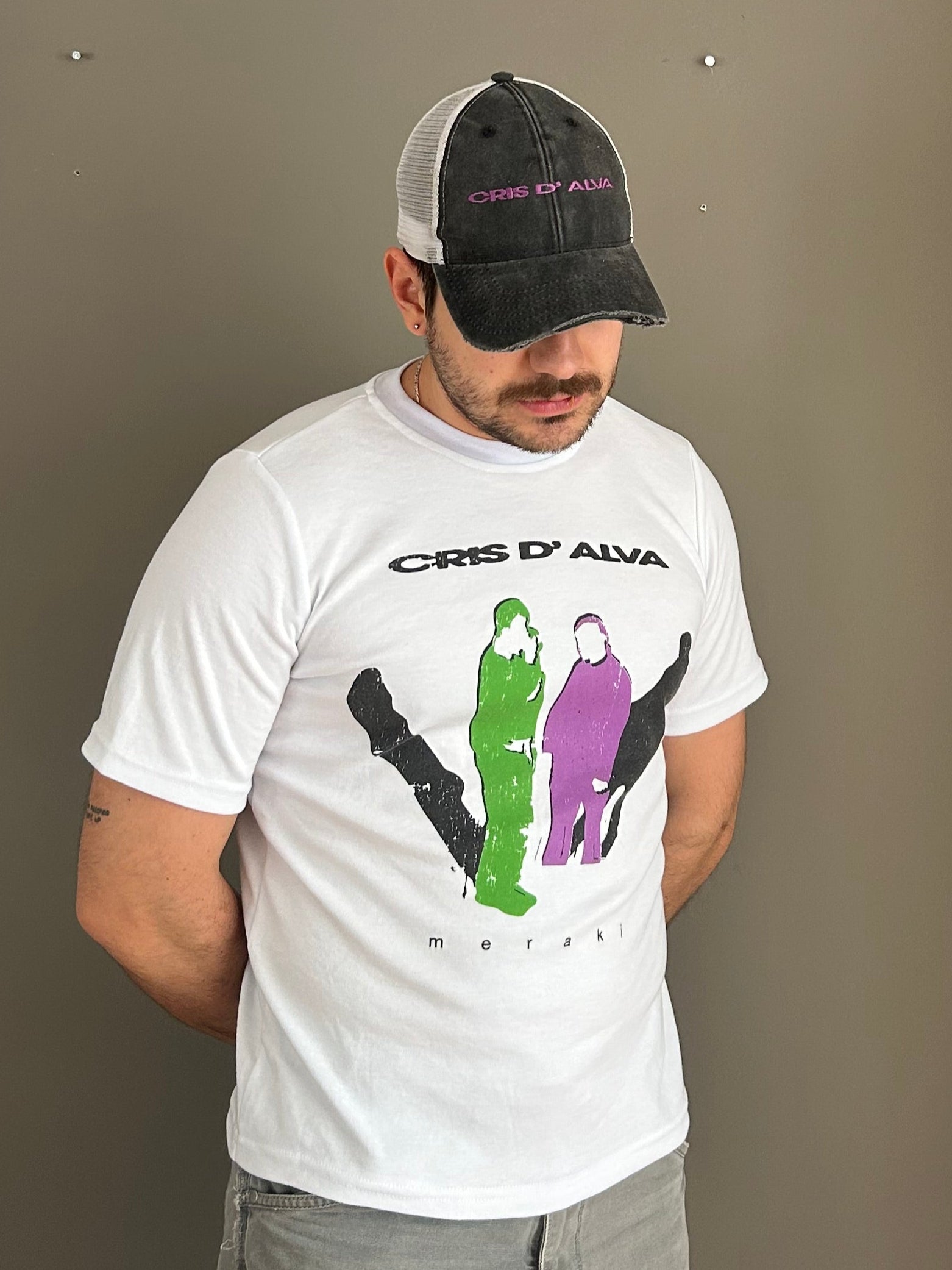 Camiseta blanca de alta calidad, 95% algodón 5% elastano. Serigrafía al frente con el logo de Cris D’alva y el tracklist completo del álbum en la parte trasera. Cómoda, duradera y perfecta para llevar música puesta.